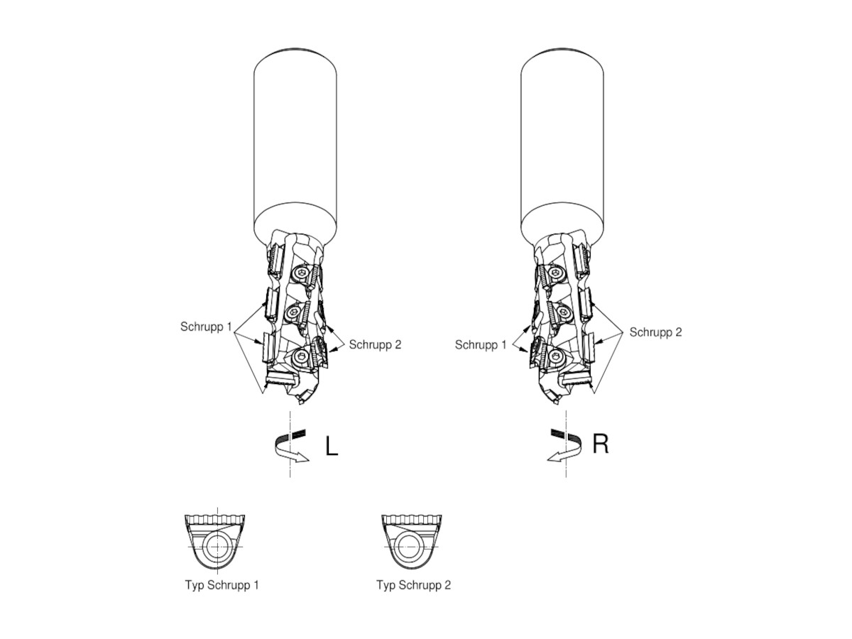 -Schneidelemente in Schruppausführung als linke + rechte Schruppschneiden mit DP (DIA) bestückt