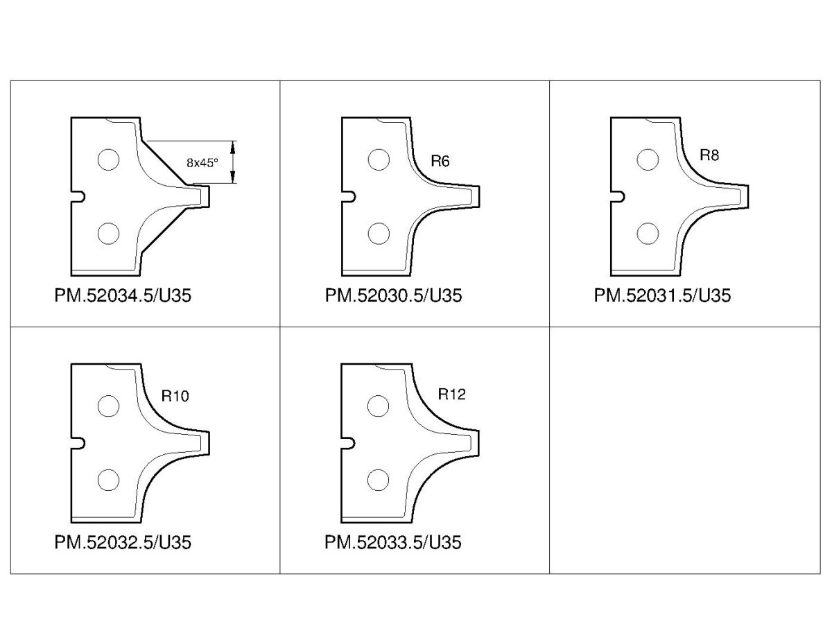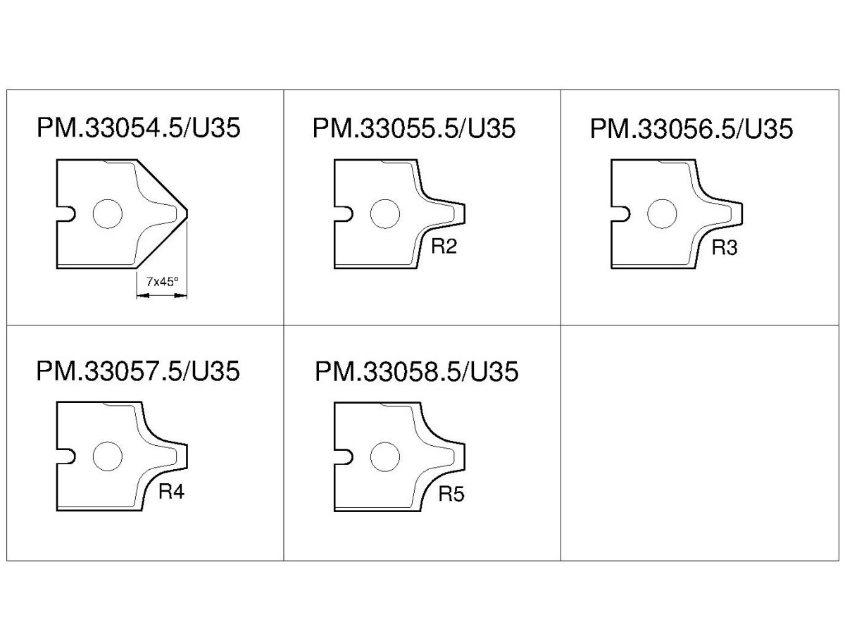 Lieferumfang: -Grundkörper inkl. Profilmesser C258-16/PM.33054.5/U35 Fase vormontiert C258-20/PM.33054.5/U35 Fase vormontiert C258-61220/PM.52034.5/U35 Fase vormontiert Soll ein anderes Messer montiert werden, ist dies bei der Bestellung anzugeben Die möglichen Profilmesser sind unten/auf der Folgeseite ersichtlich
